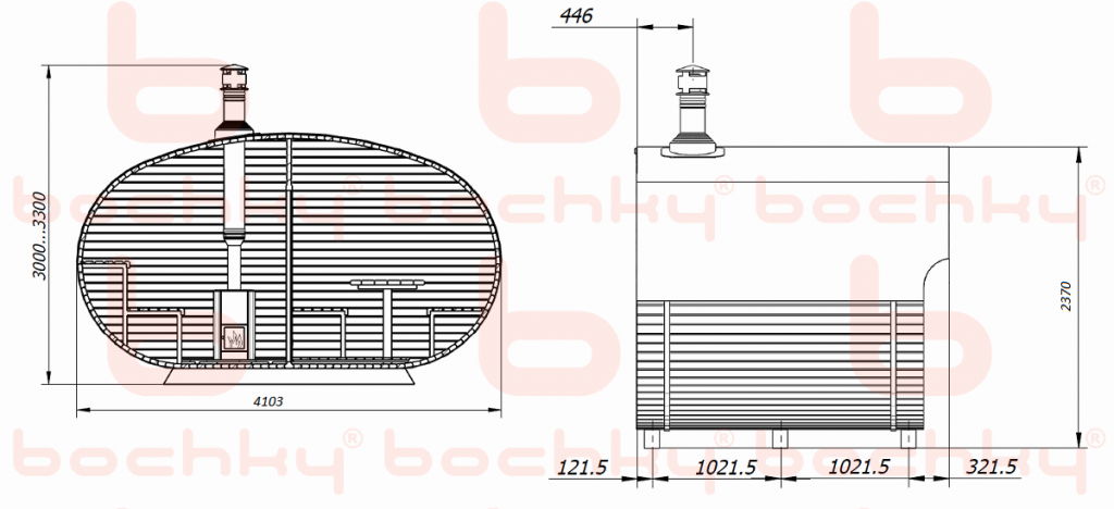 The oval barrel sauna has a flat bottom, which makes it difficult for the water to drain and obstructs further drying of the bath. We recommend to use a pallet or a shower cabin. The oval barrel sauna is ideal for a steam-bath without pouring water. For a water pouring we recommend to purchase barrel and octa saunas.